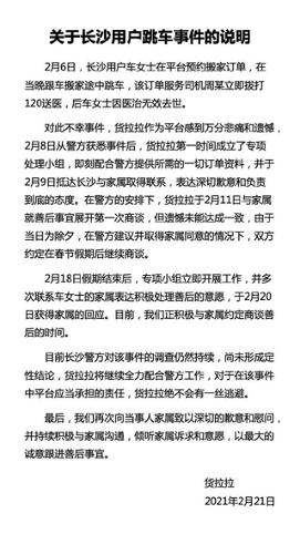 事件曝光后,21日晚,货拉拉发文回应称:2月6日,长沙用户车女士在平台预约搬家订单,在当晚跟车搬家途中跳车,该订单服务司机周某立即拨打120送医,后车女士因医治无效去世。