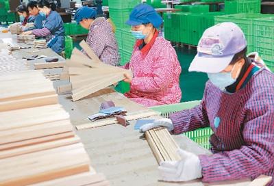 近年来,浙江省丽水市景宁畲族自治县出台鼓励招收易地搬迁村民就业等措施,帮助村民实现家门口就业。图为2月22日,该县民族创业园一家幼教装备公司的员工在白坯组装车间清点木板料。