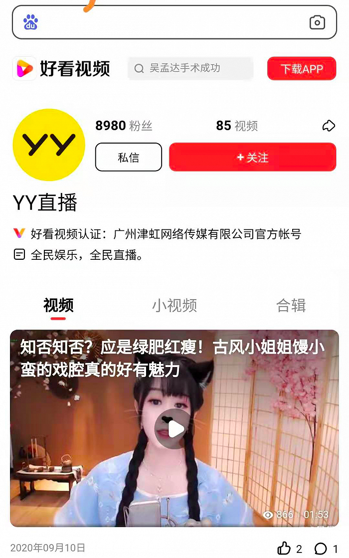 目前,百度旗下好看视频客户端里添加了YY直播的板块,好看视频的用户可以直达YY主播直播间。而且,也有网友爆料 ,“在百度贴吧的直播板块能刷到YY主播”。