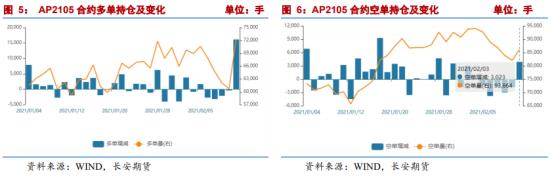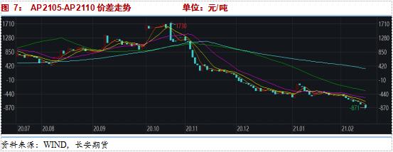 价差方面,当前AP2105合约基本维持在6000-6350之间震荡运行,截至2月19日收盘收于6301,但2月22日则出现了增仓缩量价格小幅回调的情况,表明看涨动能不足。而当前远月AP2110期价上涨较为顺畅。价差方面,随着远月合约上涨,近远合约价差负向增加至-870附近。基于AP2110交割规则放宽的考虑,当前价格存在虚高的风险。
