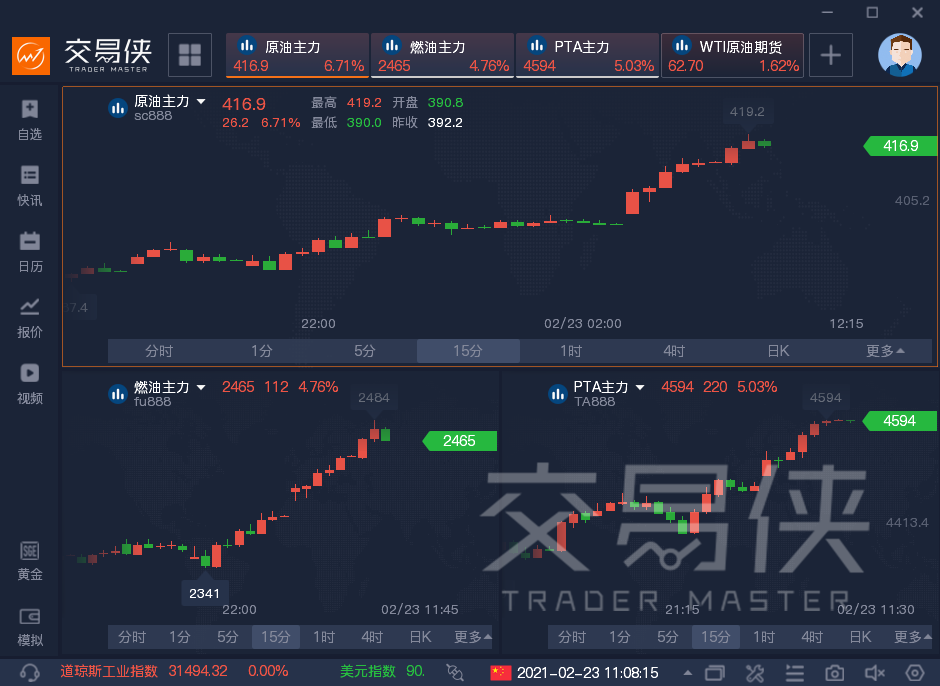 国内石油化工品种也持续走强,上海原油期货涨幅一度扩大至近7%,燃油涨5.4%,沥青、PTA涨超5%,创去年1月以来新高。