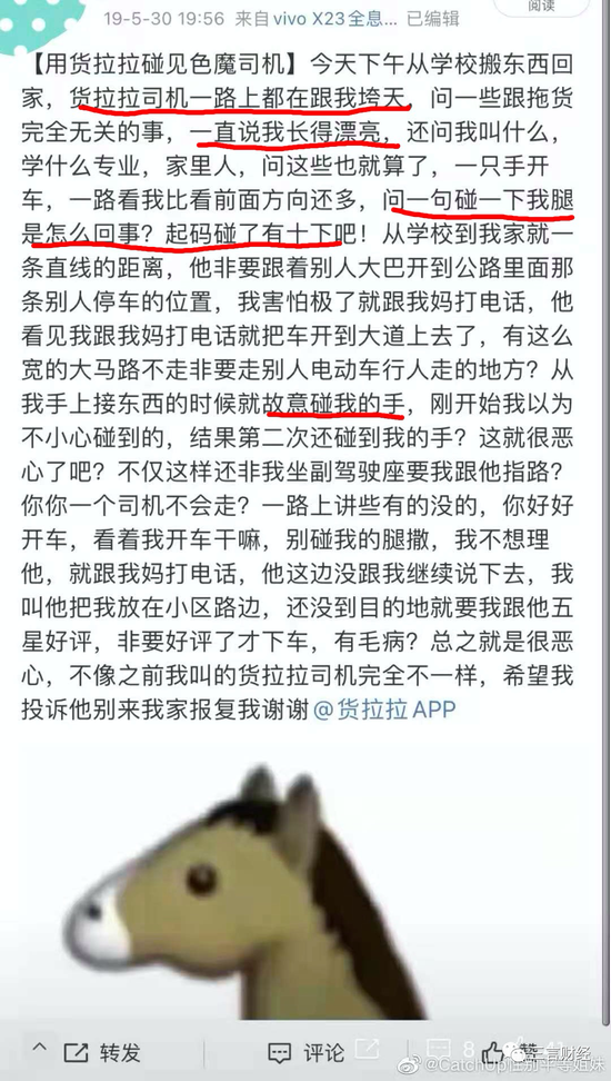 不少人发文控诉货拉拉司机骚扰用户,在搬家途中言语骚扰或触摸肢体,态度恶劣,还在搬完家后依旧骚扰用户,甚至威胁用户。