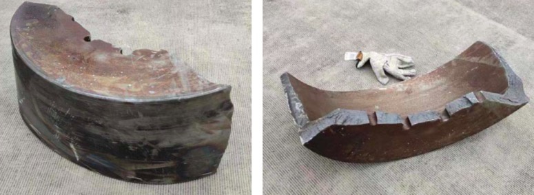 该残留物为圆弧状金属块,遗留在右机翼内,断裂边长60cm、宽25cm。其自上而下砸中飞机右机翼上表面,造成右大翼贯穿性损伤。大翼上表面为88cm*60cm敞开式损伤,下表面为60cm*45cm贯穿式损伤,内部横梁、桁条不同程度断裂、燃油回油管断裂。