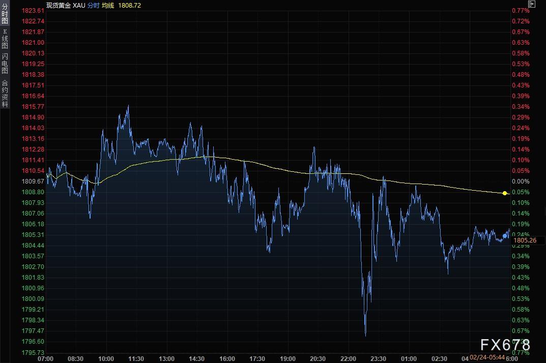 一度下跌0.7%,至1795附近,鲍威尔发表评论后,美元应声下跌,金价一度由跌转升,最终收报1805.50美元/盎司。