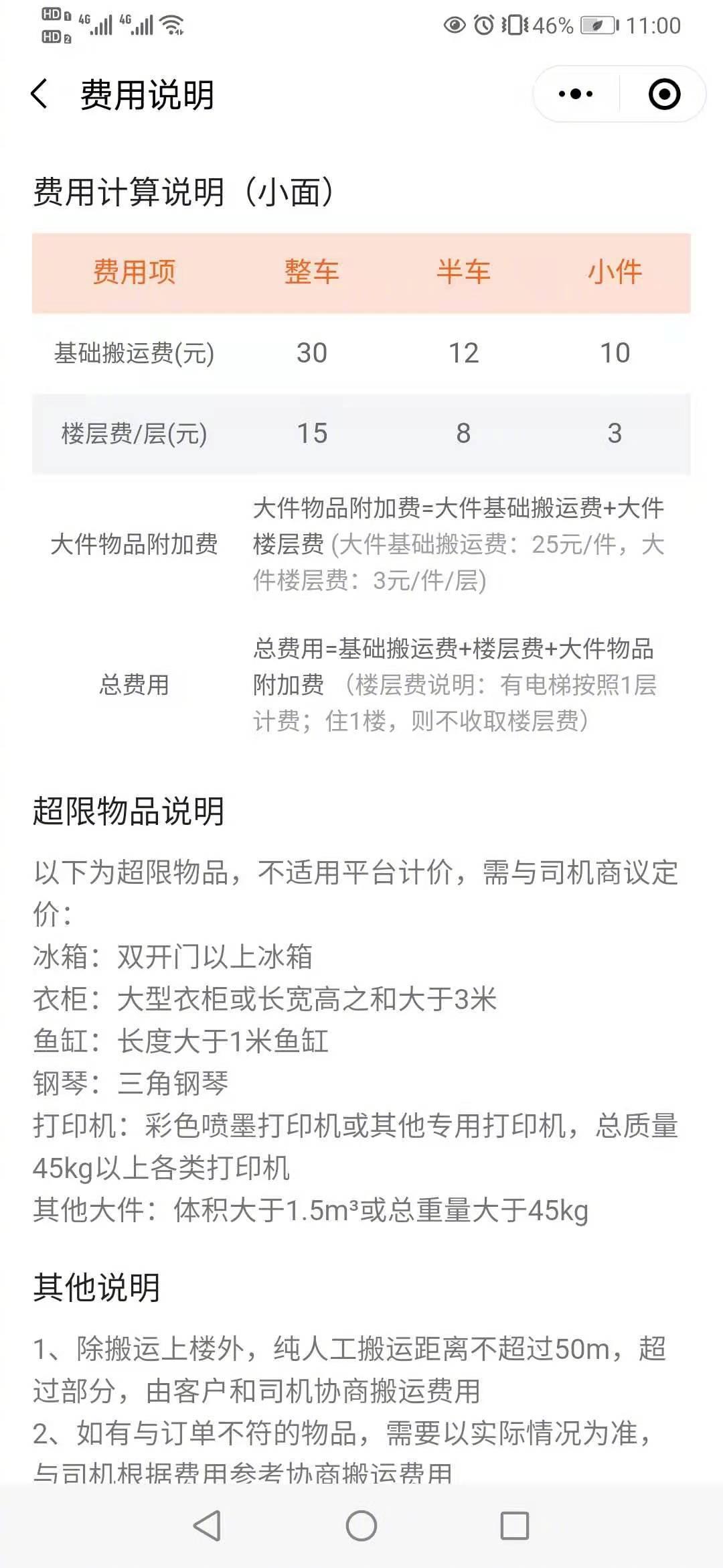 基础搬运费计算说明,但未对超限物品搬运费做出规定。App截图
