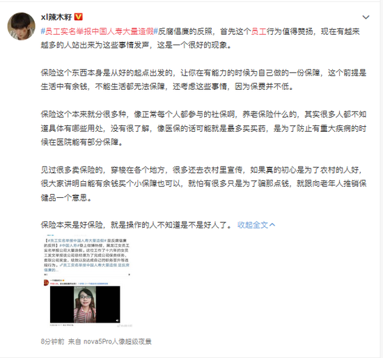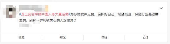 2月24日消息,#员工实名举报中国人寿大量造假#、#中国人寿#登上微博热搜。黑龙江女员工@兔宝宝1988z 实名举报公司大量造假(详见:工作十六年员工发文 实名举报中国人寿违法违规行为)。这位工作了十六年的女员工发文举报该公司总经理为了完成公司保费任务,套取公司奖金,绩效以及达成自己的职务晋升等违规行为。