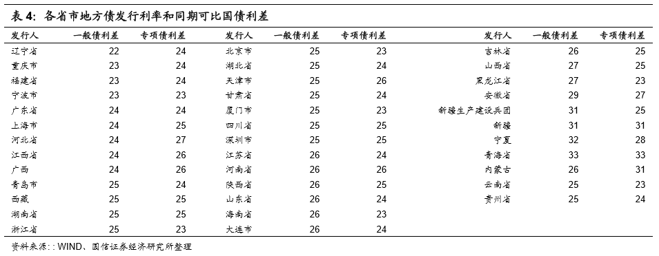 然后把2020年各省市地方政府债发行利率和同期可比国债利率相比,各地方利差见表4。从统计结果来看,各省市地方债和可比国债利差基本稳定在25BP,不管是一般地方债还是专项地方债。