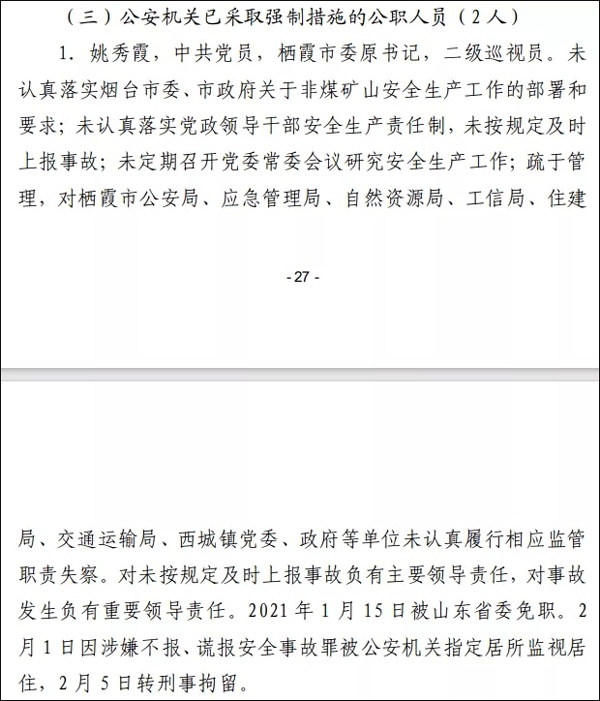 2月23日,山东省应急管理厅发布了该起事故调查报告,共50页、3万余字。原栖霞市委书记姚秀霞、原栖霞市市长朱涛的处理结果一并公布。