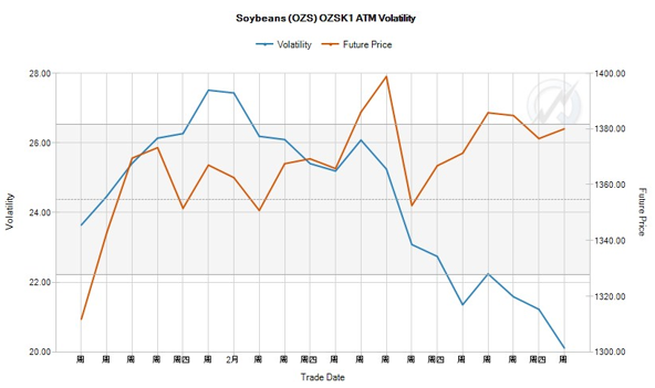 在第一部分中可以看到美豆期货ZSK1价格2月初以来在1300~1400区间内变化,那么如果在上方卖出较大压力位的看涨期权,同时在下方卖出较强支撑位的看跌期权,只要期货价格在区间变动,无论涨跌,那么每天都可以收到时间价值,同时隐含波动率不断减小,这部分也可获利。也就是说期货方向上不好交易的时候,从时间和波动率维度赚取利润,这就是期权多维交易的优势。例如卖出行权价分别为1400和1340的看涨期权和看跌期权,至今都没有突破区间范围。当然前期卖宽跨头寸到现在可以继续持有或者考虑止盈,目前隐波水平较低,已不是入场的最佳时机。