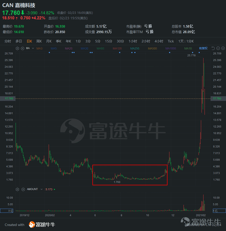 在近一个月的时间,嘉楠科技的股价从5美元附近一路飙升最高至25美元,短短时间就翻了五倍。