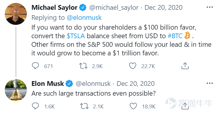 Michael Saylor可能还直接影响了马斯克对比特币的投资,此前在20年12月,Saylor建议马斯克将特斯拉的资产负债表从美元转换为比特币,算是帮特斯拉股东一个价值1000亿美元的大忙,马斯克表达了对如此巨大数额的转换是否可能。