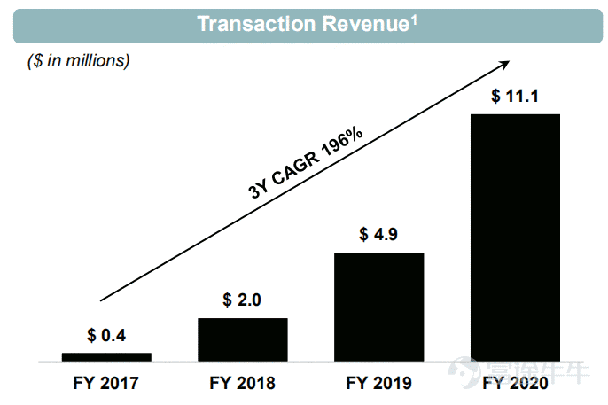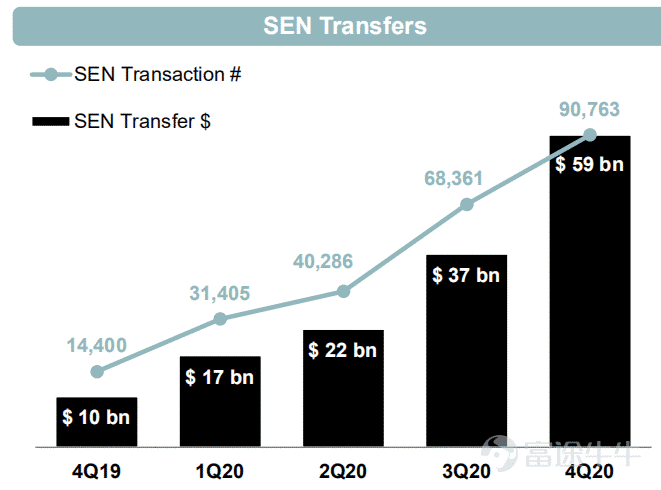 从经营数据上来看,SEN系统的交易量稳步增长,20Q4单季度处理的交易金额达590亿美元,从中获取的收入达到1110万美元,三年的复合增长率为196%。