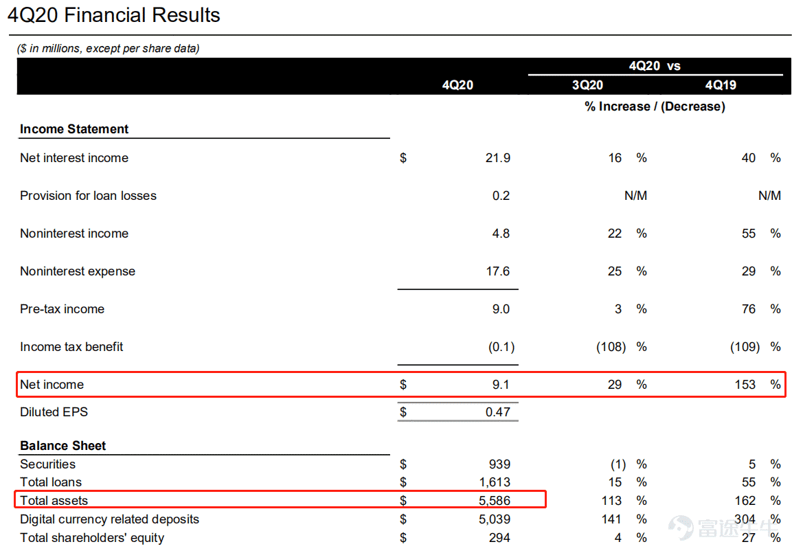 Silvergate Capital是Silvergate Bank的母公司,为数字货币行业的参与者提供金融基础设施服务。从20Q4的业绩来看,Silvergate 的总资产达到55亿美元,环比、同比增幅分别为113%、162%,充分受益于比特币暴涨;净利润的增速也十分可观,补充一句,在比特币概念股中能够实现盈利的公司相当稀少。