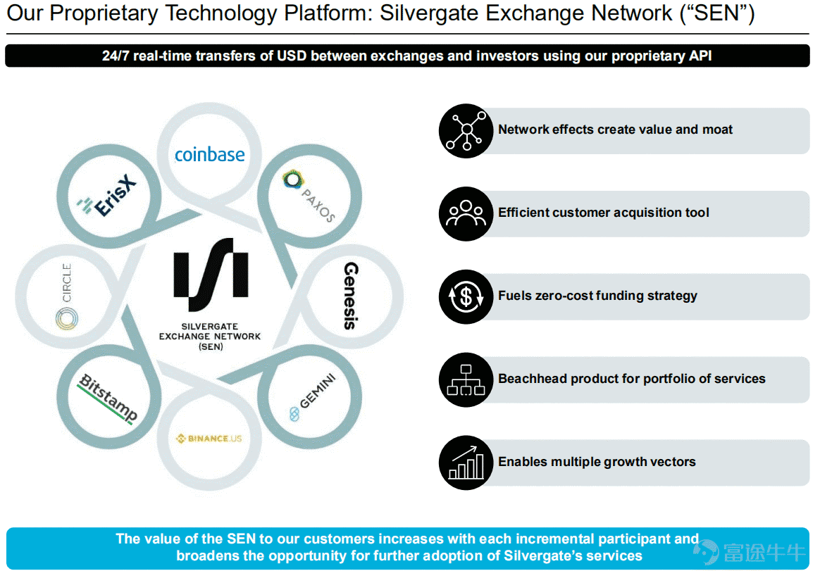 具体来看,Silvergate提供的主要服务是为数字货币的机构投资者、参与者提供美元/数字货币,还有数字货币与数字货币之间的兑换服务,这些业务是建立在其开发的Silvergate Exchange Network (‘SEN’)之上。