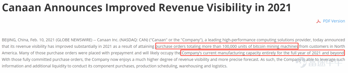 2月10日,卖矿机数钱到手软的嘉楠科技公告提高2021年的收入的可见性(Revenue Visibility),公告中称,公司拿到了北美客户超过10万台矿机的采购订单,并且由于矿机紧俏程度,其中很多订单是采用预付款的形式,订单饱满有望在2021年使公司达到满产能的状态。
