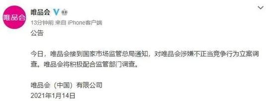 早在2021年1月14日,市场监管总局根据举报,依法对唯品会(中国)有限公司、广州唯品会电子商务有限公司涉嫌实施不正当竞争行为立案调查。唯品会官方微博在当时发布公告回应,称将积极配合监管部门调查。
