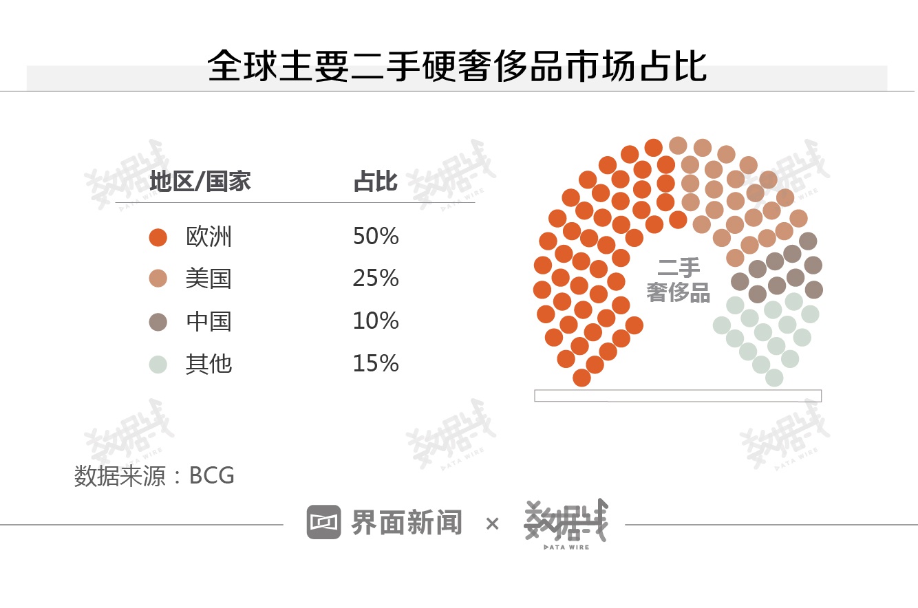 从全球来看,珠宝、手表等二手硬奢侈品卖得越来越快。据波士顿咨询2020年发布的报告,全球二手硬奢侈品市场规模约210亿欧元,年均增速达8%,快于整个奢侈品行业。其中,中国市场份额为10%,与欧洲和美国相比差距较大。据贝恩公司预计,中国个人奢侈品市场2020年在全球占比达20%,相比之下,中国二手硬奢侈品市场规模并不大。