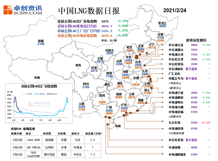 截至2021年2月24日,LNG市场均价为3645.70元/吨,环比下跌256.32元/吨,跌幅6.57%。本周由于春节的离开,下游用户相继开工,终端需求较春节期间有所增加,市场气氛有好转迹象。但目前仍有不少企业仍处假期,加之许多液厂因春节期间的满产状态而出现液位上升的情况,故虽然周内西北等地价格曾出现短暂小幅上涨,但大部分区域仍为消化节假日的累积库存而采取了降低价格的措施,接收站也相继出现下调价格的情况,目前车用、工业等方面的需求尚未完全得以恢复,国内LNG市场整体偏缓运行。