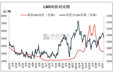 节后需求偏弱,LNG价格承压下行。卓创资讯对全国218家LNG工厂的监测数据显示,截至本周三(2月24日),开工厂家132家,LNG工厂周均开工率为47.08%,环比上周增加4.81%。LNG工厂周均日产为6360万立方米,环比上周增加293万立方米。