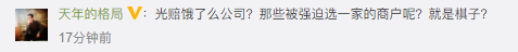 对此,有网友评论称,好多美团上的商家,真的都不让入驻饿了么。还有网友为商家呼吁,光赔饿了么公司?那些被强迫选一家的商户呢?就是棋子?