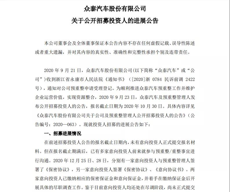 据悉,2020年9月21日,经营不善、负债累累的众泰汽车收到浙江省永康市人民法院《通知书》,法院对众泰汽车的预重整申请受理登记。两天后,众泰汽车及预重整管理人发布公开招募投资人的公告,报名截止日期为2020年10月30日。