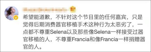@Selena Gomez的小站子 写道:“(节目组)不仅侮辱了每一位器官捐赠者,伤害了每一位进行或等待器官移植手术的患者,更是对医护人员的不尊重,这对于很多人来说是人命关天的大事,贵节目组却以此开玩笑。”