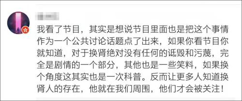 不过也有网友表示,节目的立意是好的,对于换肾绝对没有任何的诋毁和污蔑。