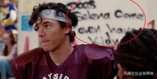而在剧中学校走廊的一面白墙上,则用黑色笔写着“Does Selena Gomez even have a kidney?(赛琳娜·戈麦斯有肾吗?)”