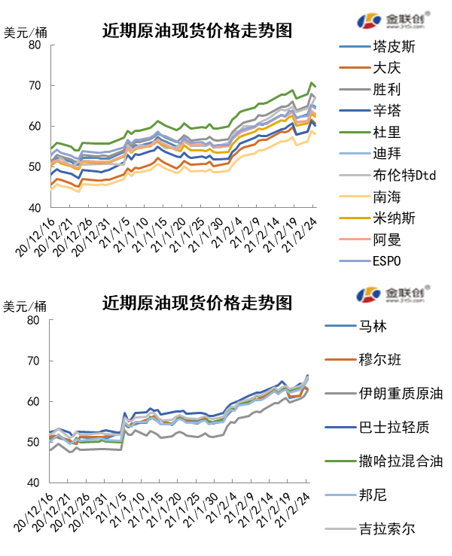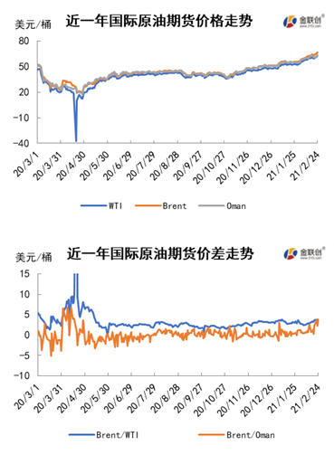本周(2.18-2.24),供应面上,美国受寒潮影响导致原油大幅减产,市场预期美国需要二至三周才能恢复受天气影响而关闭的原油开采设施,市场乐观情绪提振油价进一步上涨。需求面上,在影响原油供应的同时,美国寒潮也影响了当地炼厂生产,市场担忧美国炼厂的长时间关闭将影响原油需求,这一忧虑限制了油价涨幅。