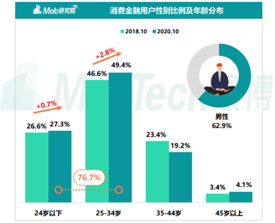 该报告指出,年轻人的超前消费的意识和需求最为强烈。消费金融用户的年龄分布上,34岁以下人群占比近八成,且比例持续上升。