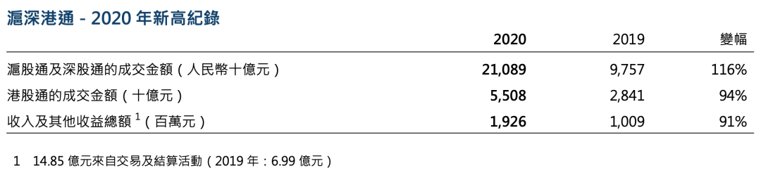 2020年是沪港通开通六周年及深港通开通四周年。根据香港交易所披露的数据,2020年沪深港通成交额及平均每日成交额均创新高,其中北向交易及南向交易的成交金额分别达人民币21.09万亿元及5.51万亿港元;平均每日成交金额分别达人民币913亿元及244亿港元。
