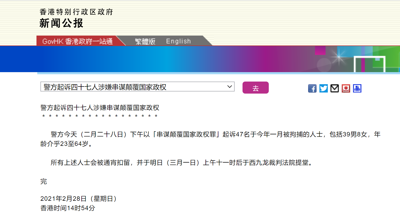 香港特区政府28日也发布新闻公报称, 警方今天(2月28日)下午以“串谋颠覆国家政权罪”起诉47名于今年一月被拘捕的人士,包括39男8女,年龄介乎23至64岁。所有上述人士会被通宵扣留,并于明日(3月1日)上午十一时后于西九龙裁判法院提堂。