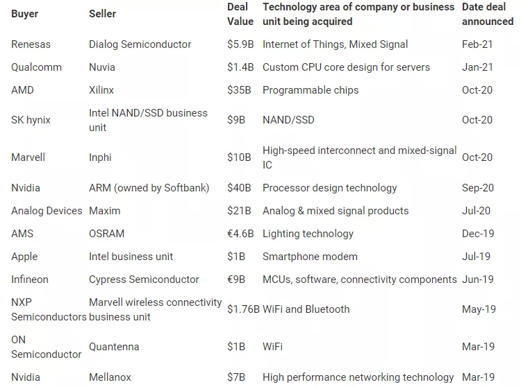2019年以来,全球半导体重大并购项目总金额已经接近了1000亿美元,是此前的几倍。