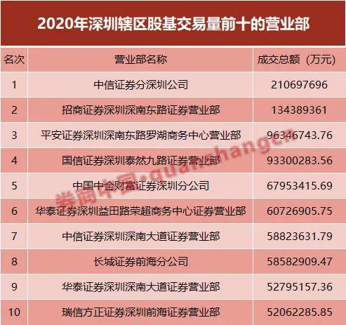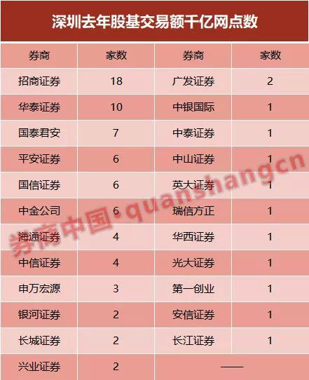 502家网点中,全年交易额过万亿的有2家,分别为中信证券深圳分公司和招商证券深圳深南东路营业部,两家营业部全年股基交易额分别达到2.11万亿和1.34万亿。