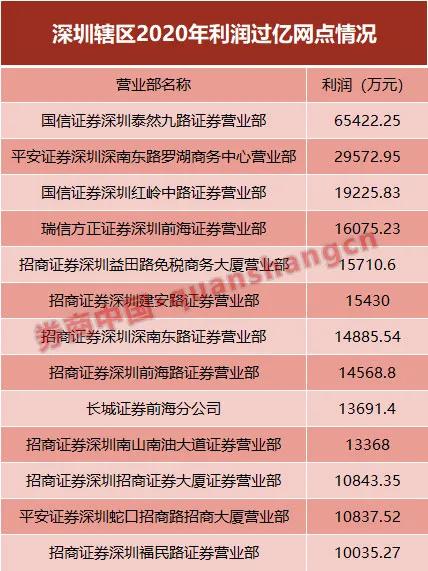 随着佣金的持续下滑,交易量已不能完全决定网点最后的营收。数据显示,去年深圳辖区502家网点,全年股基成交额共计32.16万亿元。其中,成交额最大的3家网点分别为中信证券深圳分公司、招商证券深南东路营业部和平安证券深南东路罗湖商务中心营业部。