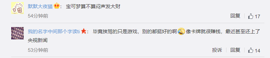 有网友表示,“宝可梦是一个好IP,但是游戏gf是个垃圾公司”。“ 毕竟挨骂的只是游戏,别的都挺好的啊,像卡牌就很赚钱,最近甚至还上了央视新闻”。