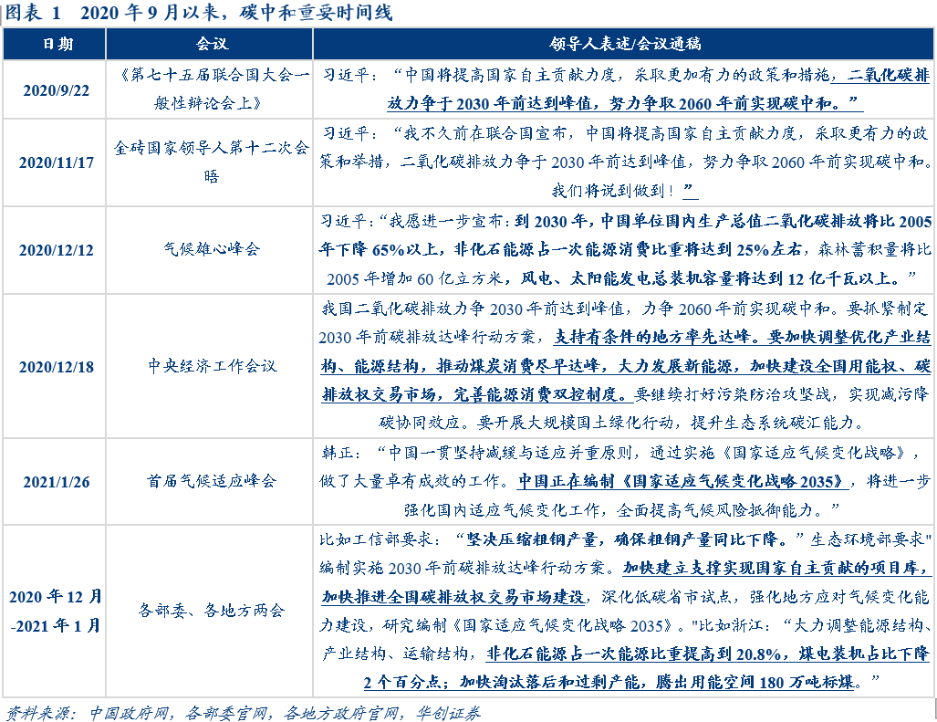 2020年9月22日,总书记提出“二氧化碳排放力争于2030年前达到峰值,努力争取2060年前实现碳中和”。2020年12月16-18日召开的中央经济工作会议上对碳达峰、碳中和予以部署。2020年12月下旬-2021年1月,各部委年度工作会议、各地方政府两会对碳达峰、碳中和作出针对性工作安排。