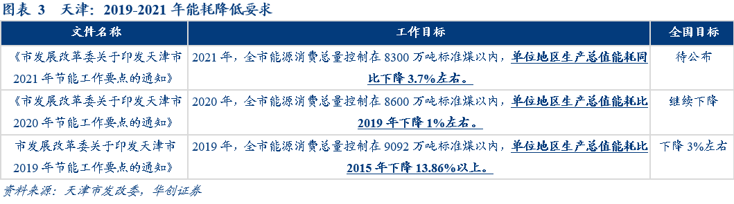 天津市,2月20日发布《关于印发天津市2021年节能工作要点的通知》,要求2021年全市能源消费总量控制在8300万吨标准煤以内,单位地区生产总值能耗同比下降3.7%左右。其中,单位GDP能耗下降幅度高于2020年1%的目标,也高于2019年的目标(2016-2019年四年复合下降速度为3.3%)。