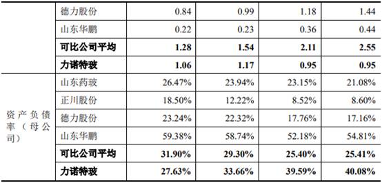 同行业可比公司的资产负债率均值分别为25.41%、25.40%、29.30%和31.90%,流动比率均值分别为3.17、2.71、2.11和1.81,速动比率的均值分别为2.55、2.11、1.54和1.28。