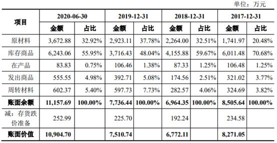 2017年至2020年上半年各期末,力诺特玻的存货账面价值分别为8271.05万元、6772.11万元、7510.74万元和10,904.70万元,最近一期增幅明显。招股书中称主要是2020年上半年原材料和库存商品大幅增加所致,两者合计增长3276.40万元。