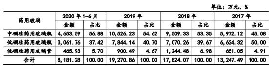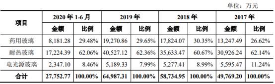 2017年至2020年上半年,公司药用玻璃的销售收入分别为13,247.49万元、17,284.07万元、19,270.86万元和8181.28万元,占比26.62%、30.35%、29.65%和29.48%;耐热玻璃销售收入分别为30,926.24万元、35,633.47万元、40,527.12万元和17,224.39万元,占比62.14%、60.67%、62.36%和62.06%;电光源玻璃产品收入分别为5595.47万元、5277.41万元、5189.33万元和2347.10万元,年复合增长率为-3.70%,占比11.24%、8.99%、7.99%和8.46%。