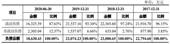 2017年至2020年上半年各期末,力诺特玻的负债分别为22,794.60万元、23,000.65万元、23,074.23万元和18,630.43万元,流动负债分别为21,916.70万元、22,365.60万元、21,537.16万元和16,325.39万元,占比分别为96.15%、97.24%、93.34%和87.63%。