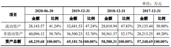 2017年至2020年上半年各期末,力诺特玻的资产总额分别为57,348.69万元、58,580.31万元、69,181.76万元和68,239.68万元,其中流动资产分别为29,135.44万元、28,018.94万元、32,681.53万元和28,143.57万元。