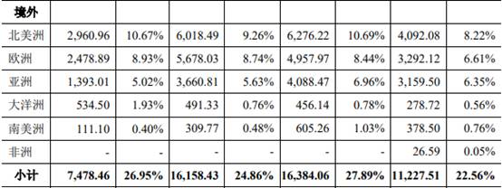 2017年至2020年上半年,力诺特玻主营业务收入中的境外销售金额分别为11,227.51万元、16,384.06万元、16,158.43万元和7478.46万元,占各期主营业务收入的比例分别为22.56%、27.89%、24.86%和26.95%。