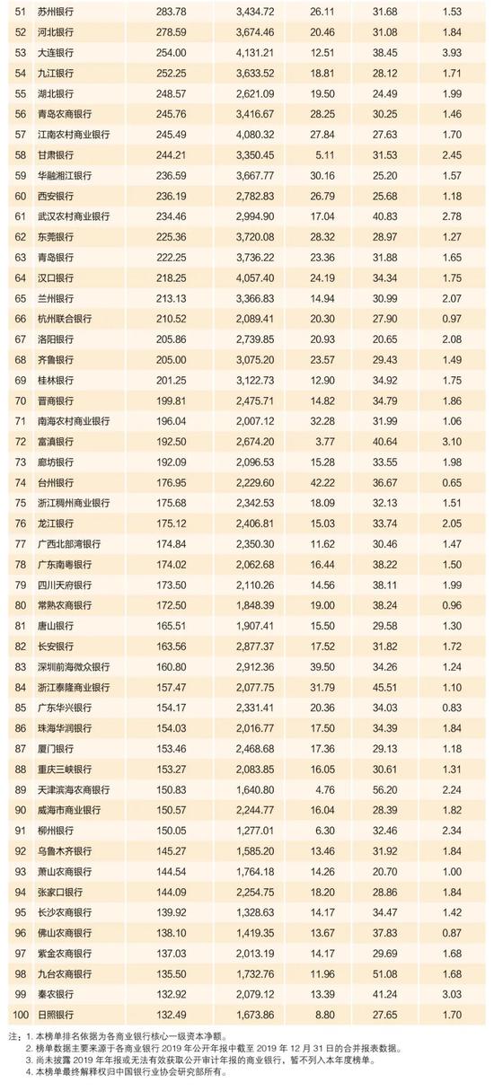 为积极发挥社会组织平台作用,推动银行业实现高质量发展,中国银行业协会连续5年发布“中国银行业100强榜单”。本榜单遵循简单、客观、专业原则,参考巴塞尔协议Ⅲ和监管机构相关要求,按核心一级资本净额排序,并附加资产规模、净利润、成本收入比、不良贷款率等指标作为参考。榜单数据主要来源于各商业银行2019年公开年报,并覆盖所有中资商业银行,具有较高的权威性、客观性和专业性。本年度上榜100家银行资产总和占商业银行总资产的90.5%,创造了商业银行95.0%的净利润。