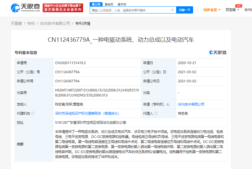 据天眼查APP显示,3月2日,华为技术有限公司公开两项名为“一种电驱动系统、动力总成以及电动汽车”的发明专利,公开号CN112436747A、CN112436779A,申请日期均为2020年10月21日。