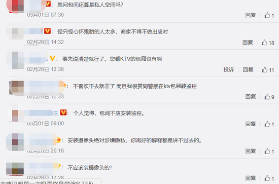 对于包间内安装摄像头一事,网友炸开了锅。有网友表示,“就问问包间还算是私人空间吗”,“安装摄像头绝对涉嫌隐私,你再好的解释都是讲不过去的。”。另有网友表示,“怪只怪心怀鬼胎的人太多,商家不得不做出应对”,“事先说清楚就行了。您看KTV的包厢也有啊”
