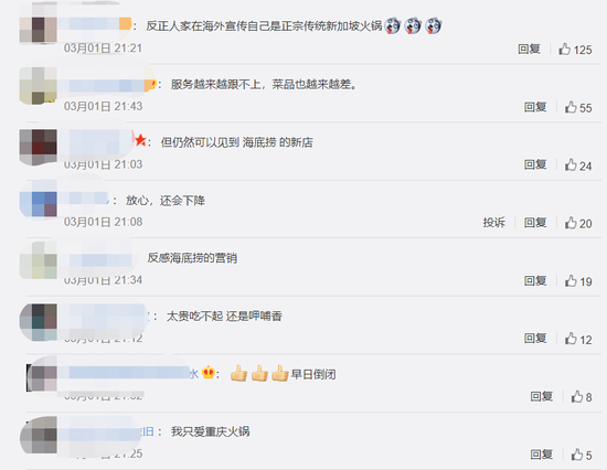对于海底捞业绩下滑逾90%,引发网友热议。有网友表示,“反正人家在海外宣传自己是正宗传统新加坡火锅”,“放心,还会下降”,“服务越来越跟不上,菜品也越来越差。”“反感海底捞的营销”。