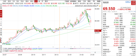 值得注意的是,2020年海底捞业绩虽然大幅下滑,2020年上半年更是亏损10个亿,但公司股价大幅上涨逾90%,公司股价从2020年2月底27.45港元一路涨到年末的59.7港元,今年进一步涨到69.55港元,市值高达3686亿港元。