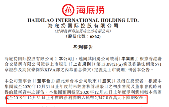 3月1日晚间,海底捞(06862.HK)在港交所公告称,预期2020年度净利润相较2019年下降约90%。据公告显示,海底捞2019年的净利润为23.47亿元,意味着2020年海底捞的净利润仅有2.35亿元。